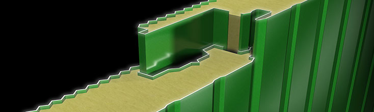 Pre-insulated metal panels with mineral fiber insulation for walls with hidden joint (also available in the version with perforated inner support).